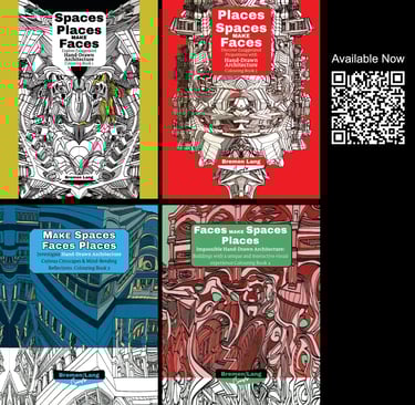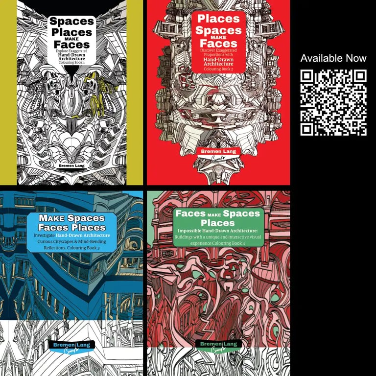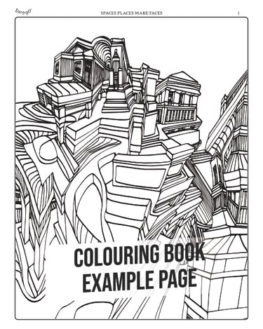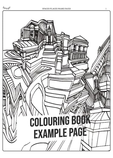 Spaces Places Make Faces is a visionary colouring book series that transforms exaggerated, hand-drawn architecture into a playground of hidden identities and surreal perspectives.